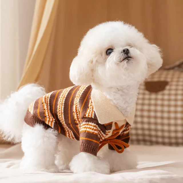 What sets this sweater apart is its thoughtful design. The lapel detail gives your pet a dressed-up, charming look while the striped pattern adds a playful vibe. It’s not just another pet sweater—it’s a stylish statement that combines fashion with function. Treat your furry friend to comfort and style this autumn, and watch them turn heads wherever they go.
